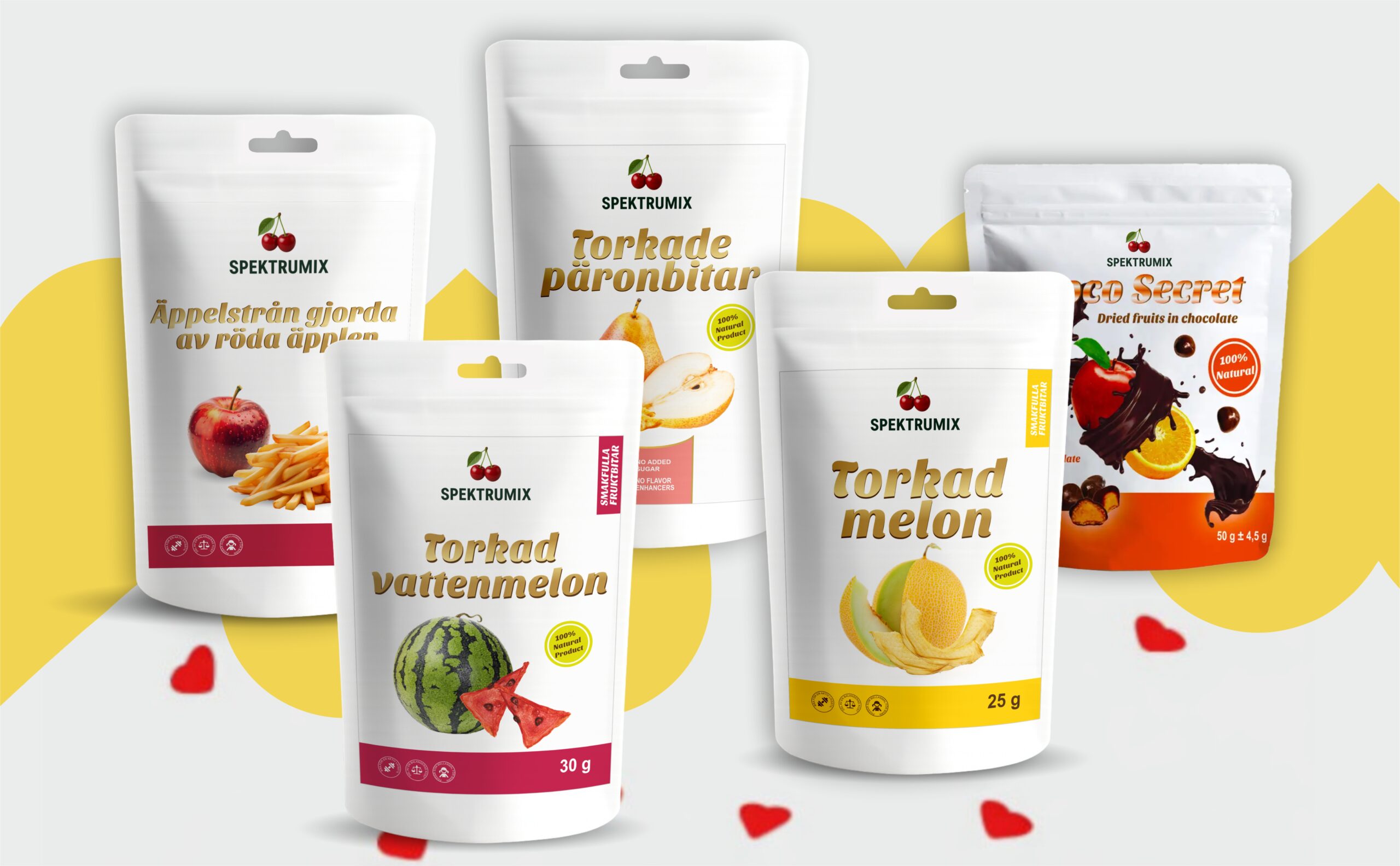 Spektrumix bjuder på läckra snacks av torkad frukt, bär, grönsaker samt konfektyr – varsamt framställda för att bevara den naturliga smaken och råvarornas karaktär, utan tillsatta konserveringsmedel. Ett smakrikt och naturligt val för dig som vill njuta av frukt-, bär- och grönsaksbaserade snacks i vardagen.