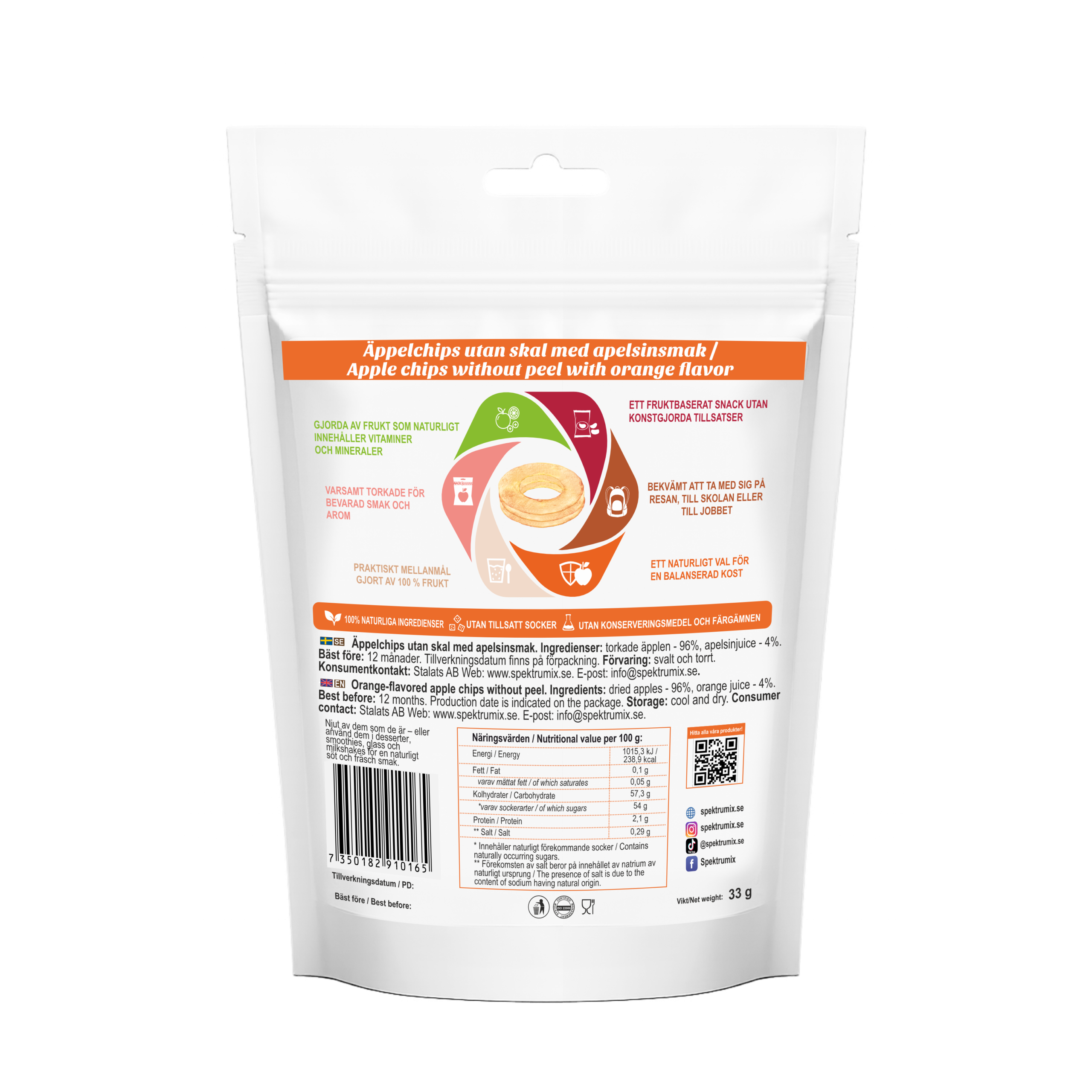 Ingredienser: Torkade äpplen – 96 %. Tillverkas av utvalda äppelsorter samt 4% apelsinjuice.