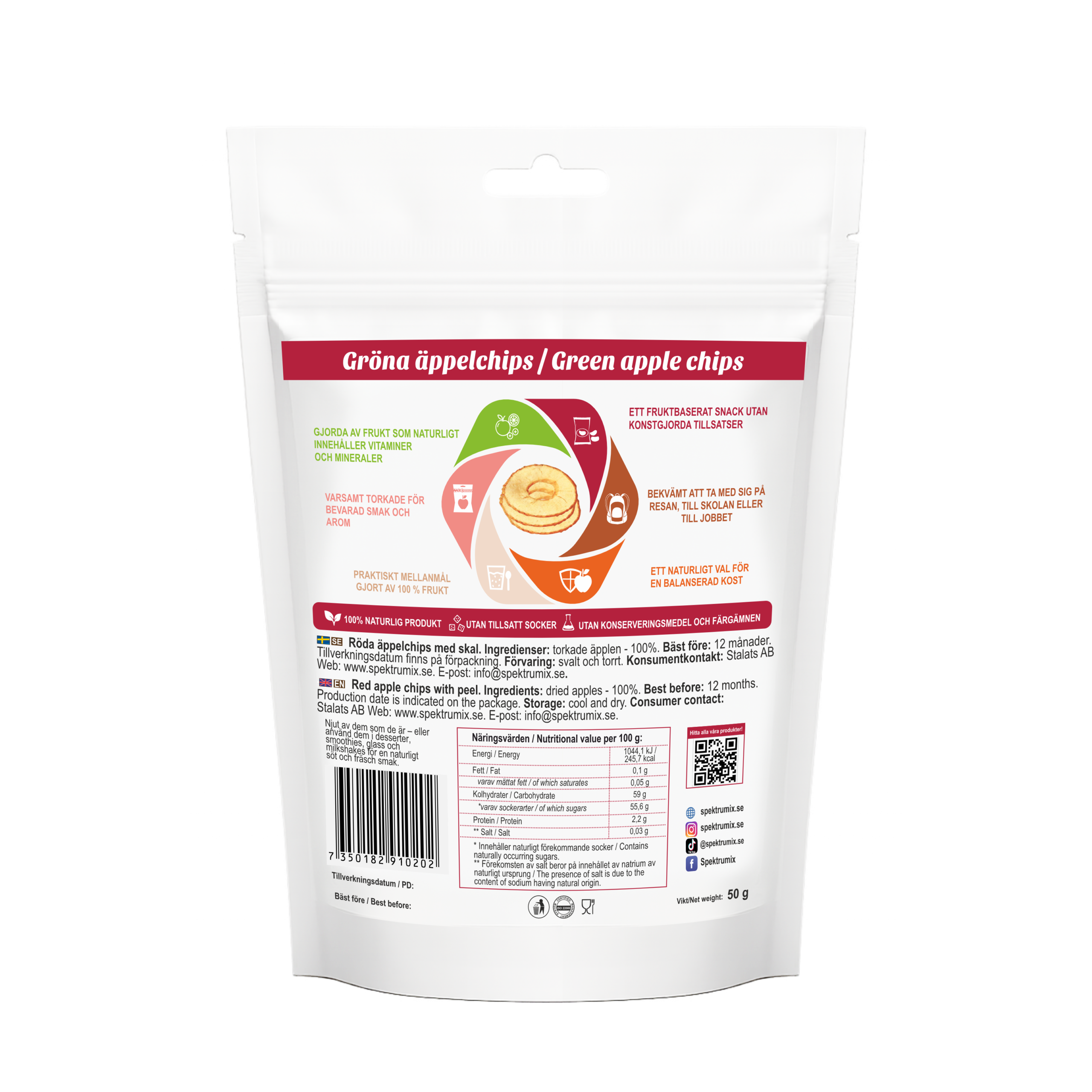 Ingredienser: Torkade äpplen – 100 %. Tillverkas uteslutande av röda äppelsorter.