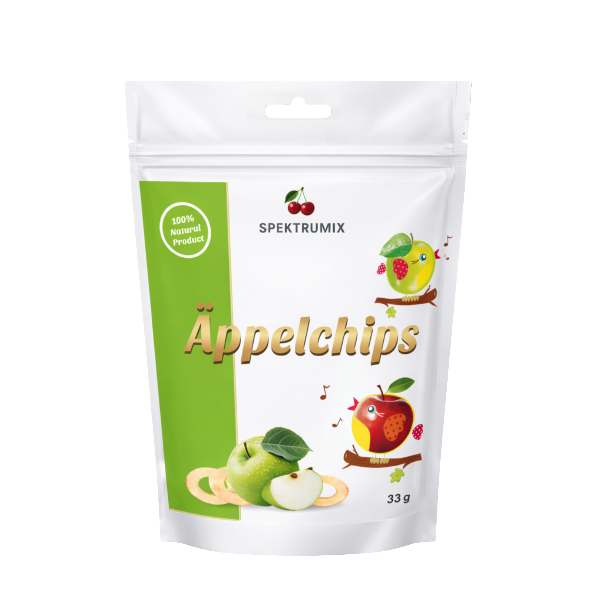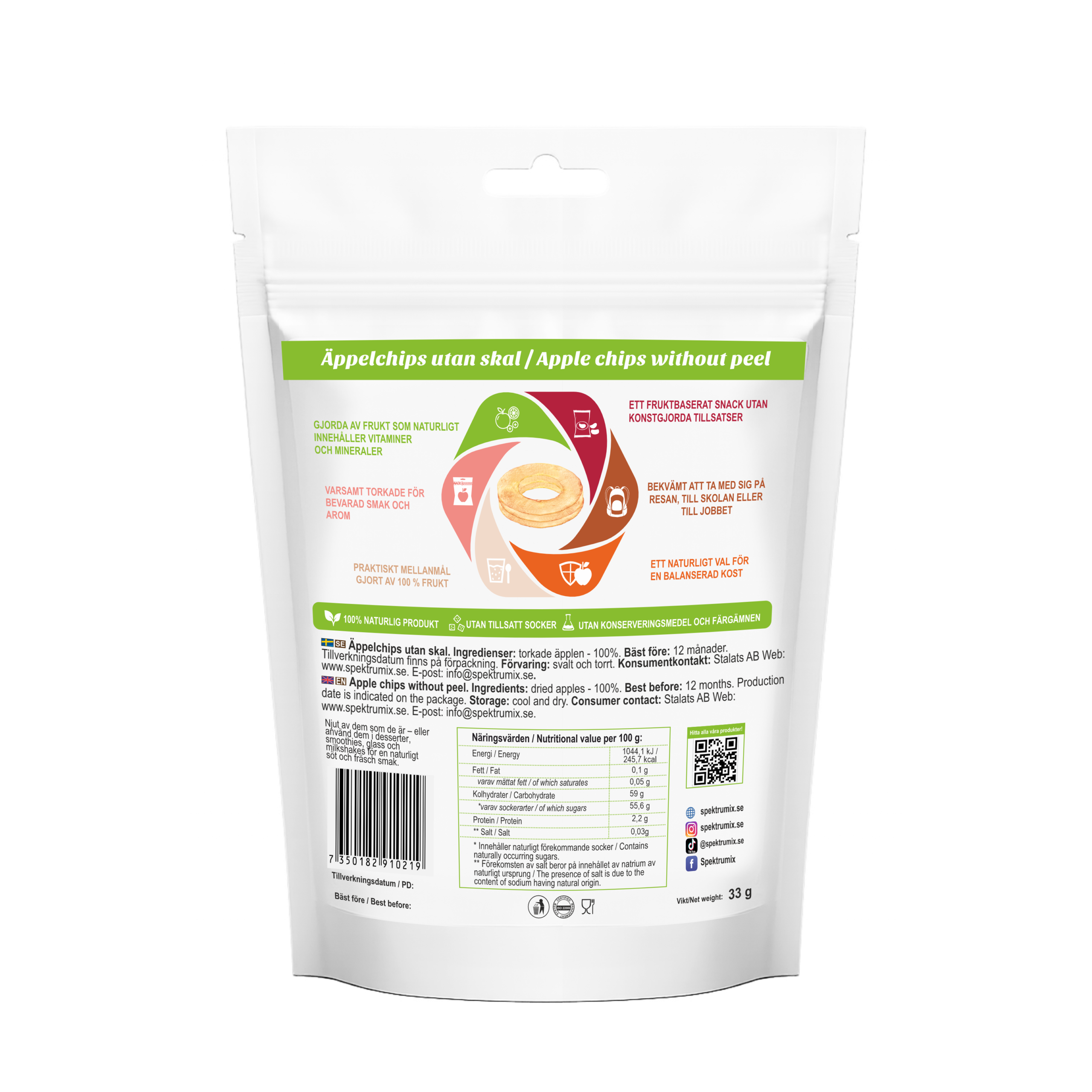 🍏 Ingredienser: Torkade äpplen – 100 %. Tillverkas uteslutande av gröna äppelsorter. Vikt: 33 g