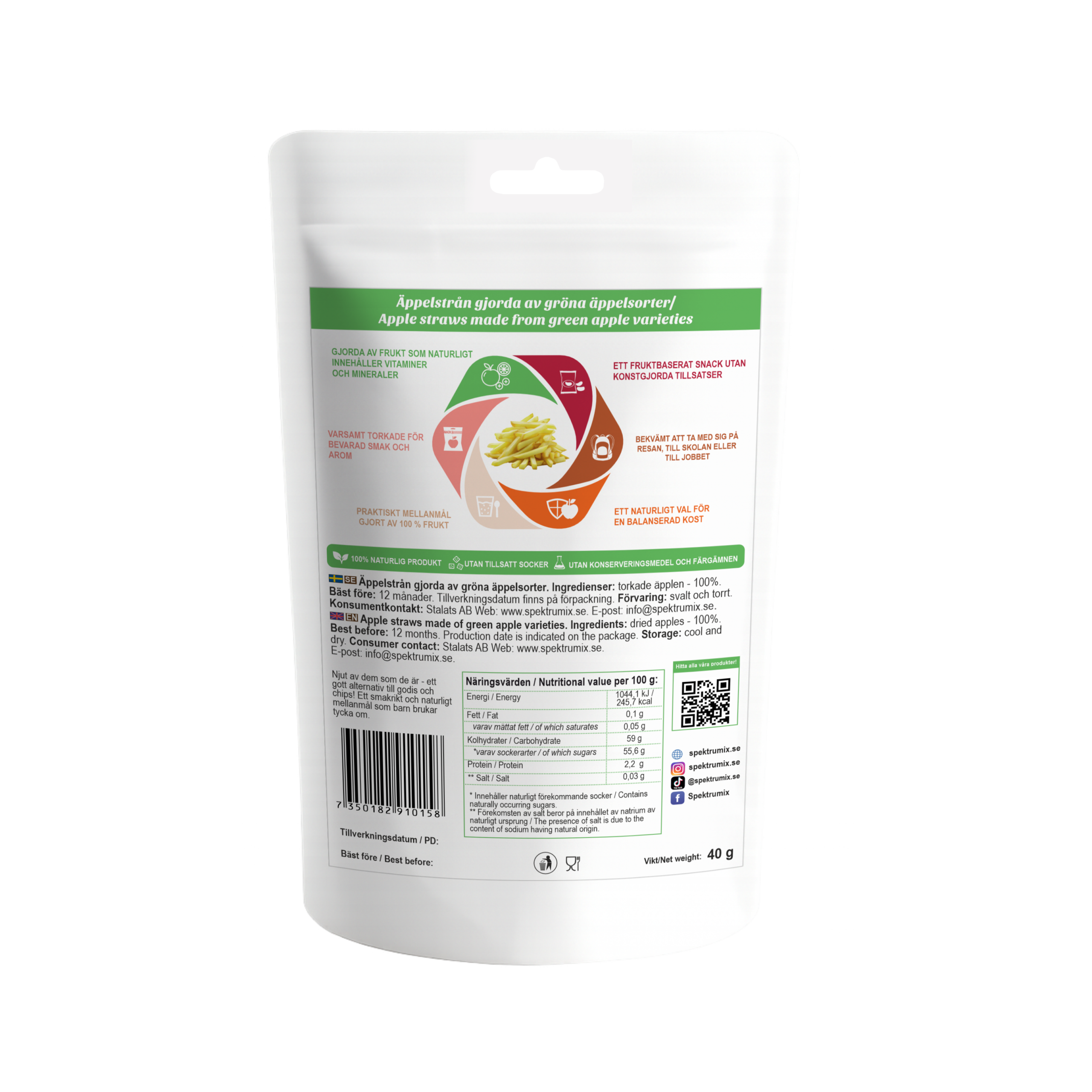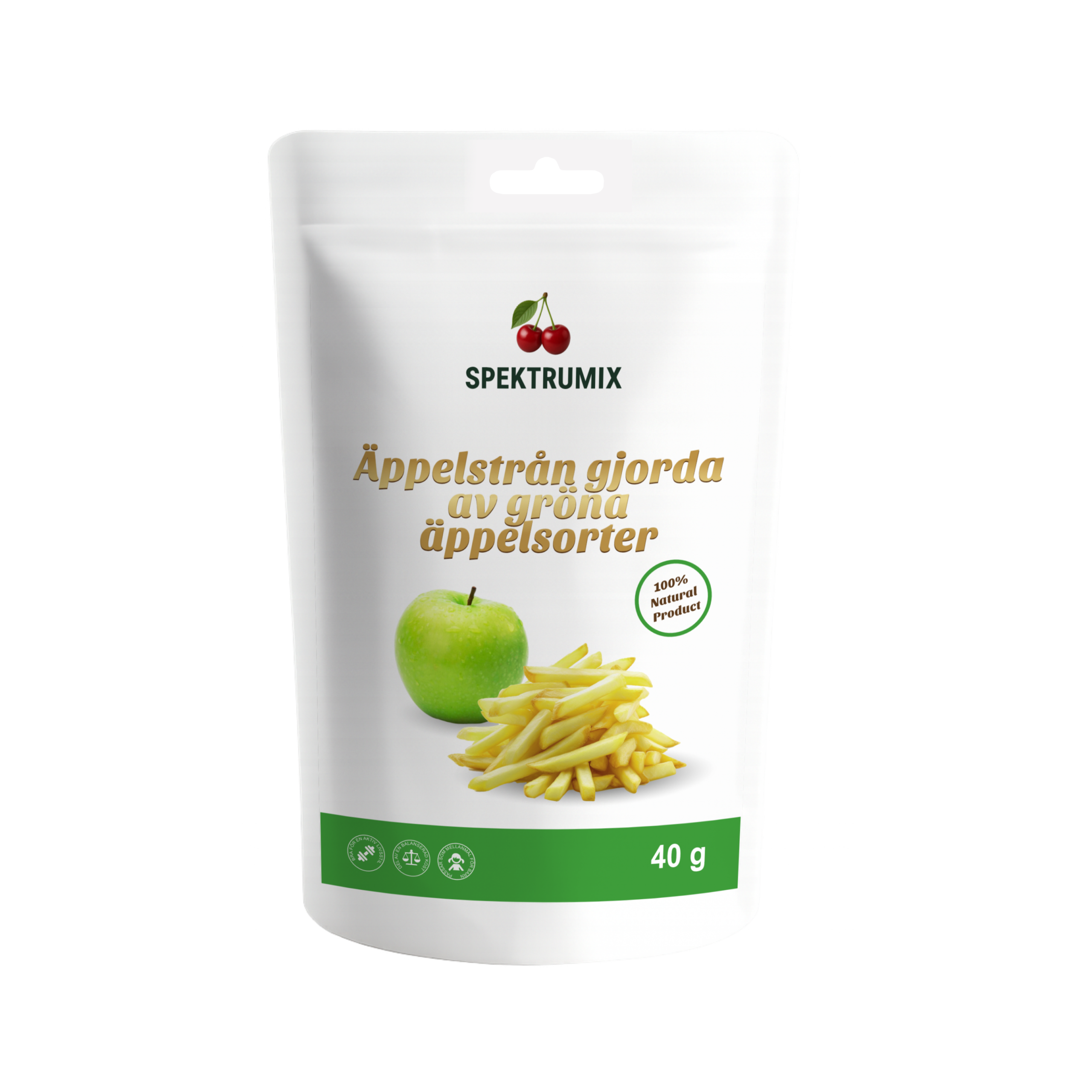 🍏 Ingredienser: Torkade äpplen – 100 %. Tillverkas uteslutande av gröna äppelsorter. Vikt: 50 g