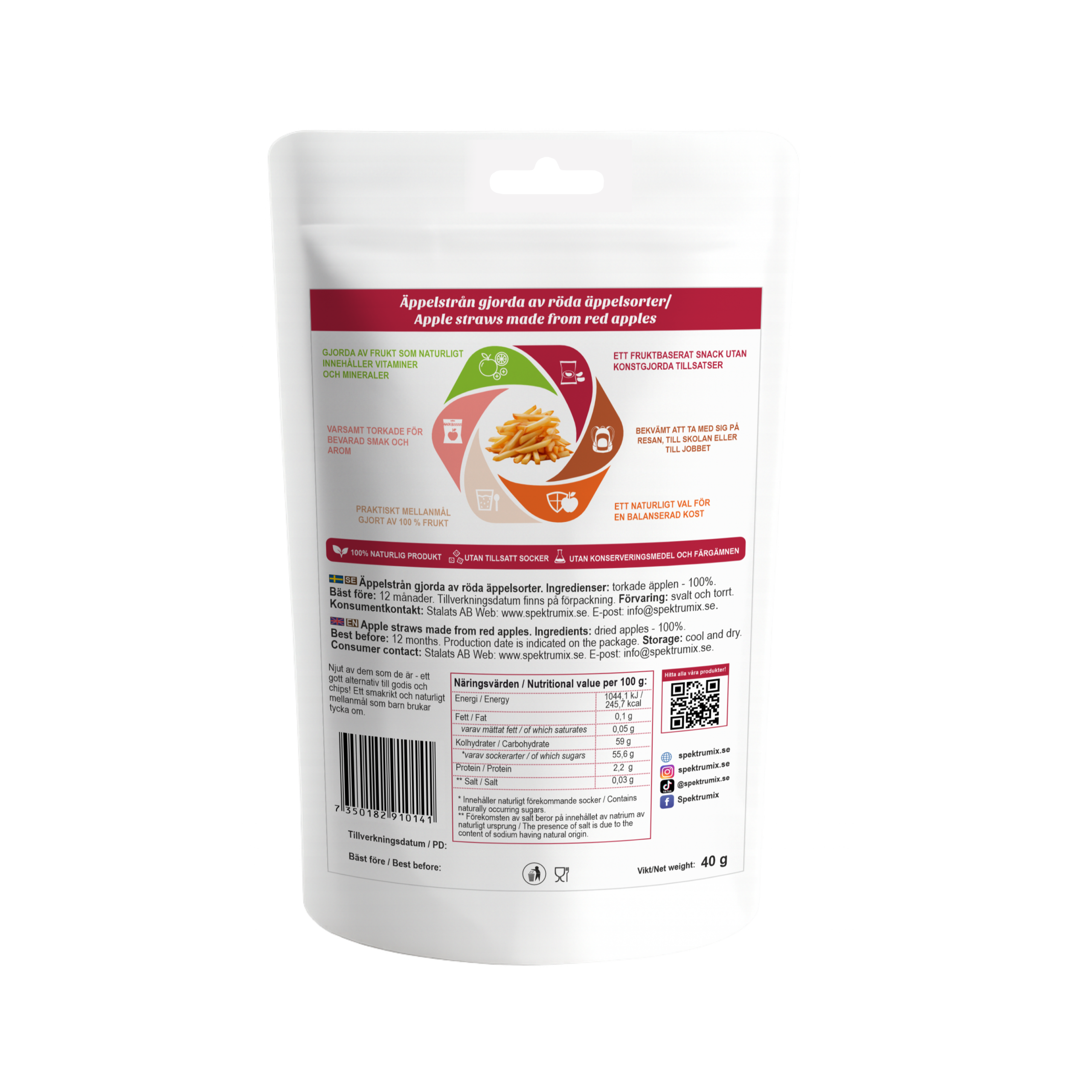 🍎 Ingredienser: Torkade äpplen – 100 %. Tillverkas uteslutande av röda äppelsorter. Vikt: 50 g