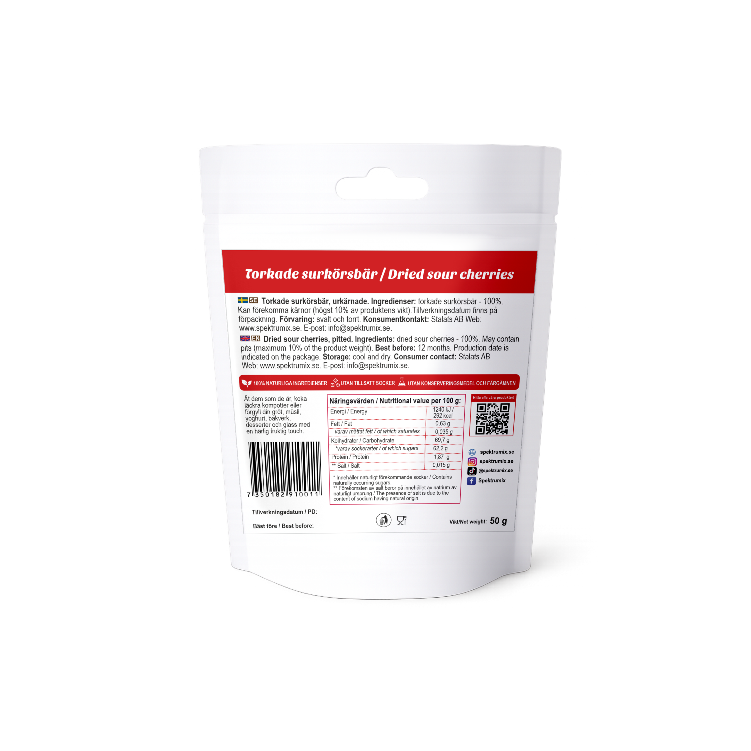🍒 Ingredienser: Torkade surkörsbär – 100 %. Kan förekomma kärnor (högst 10 % av produktens vikt). Vikt: 50 g