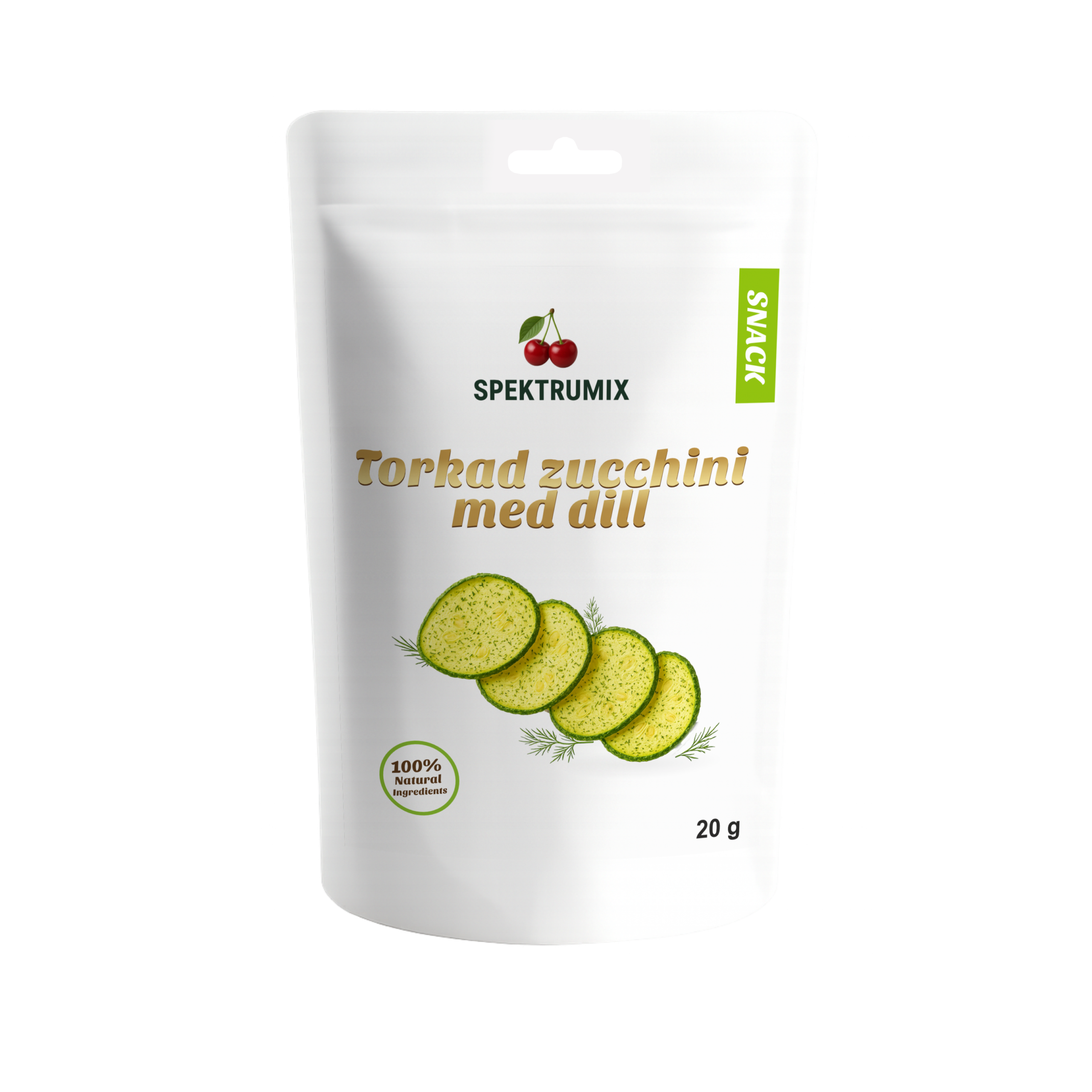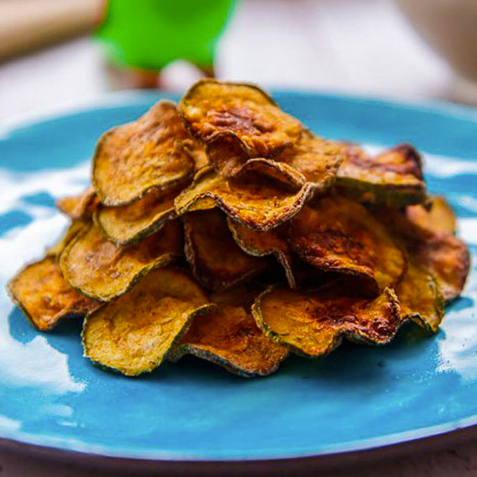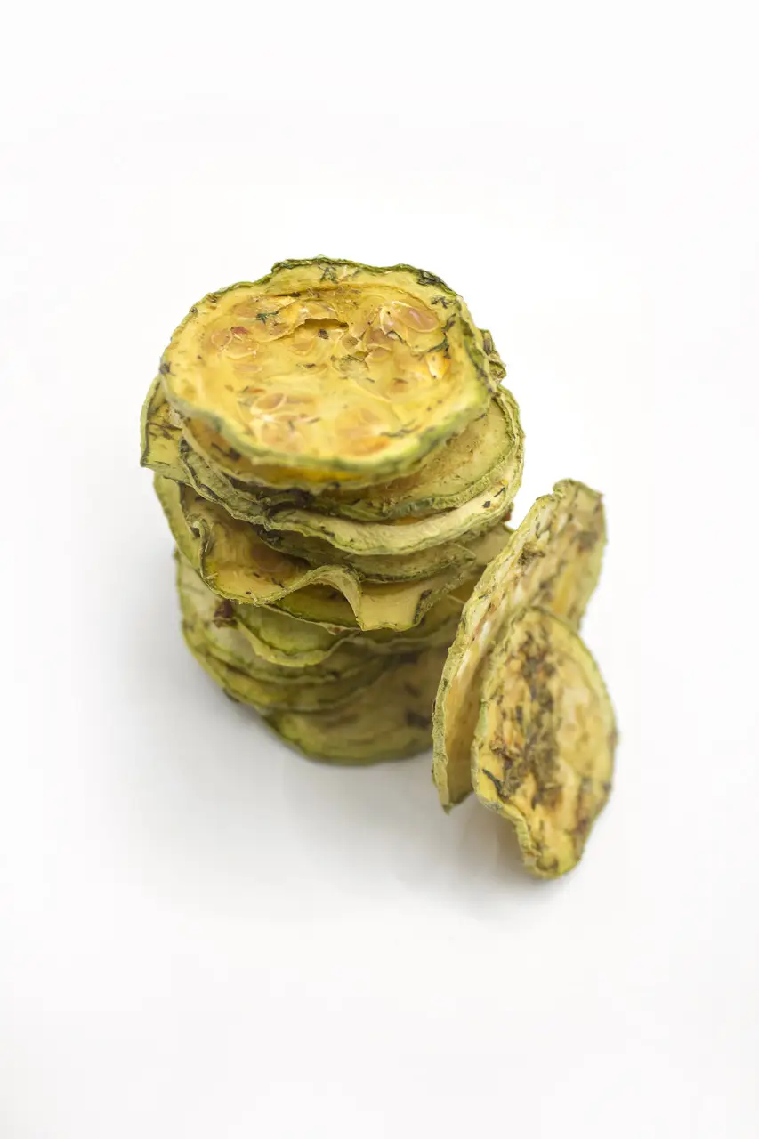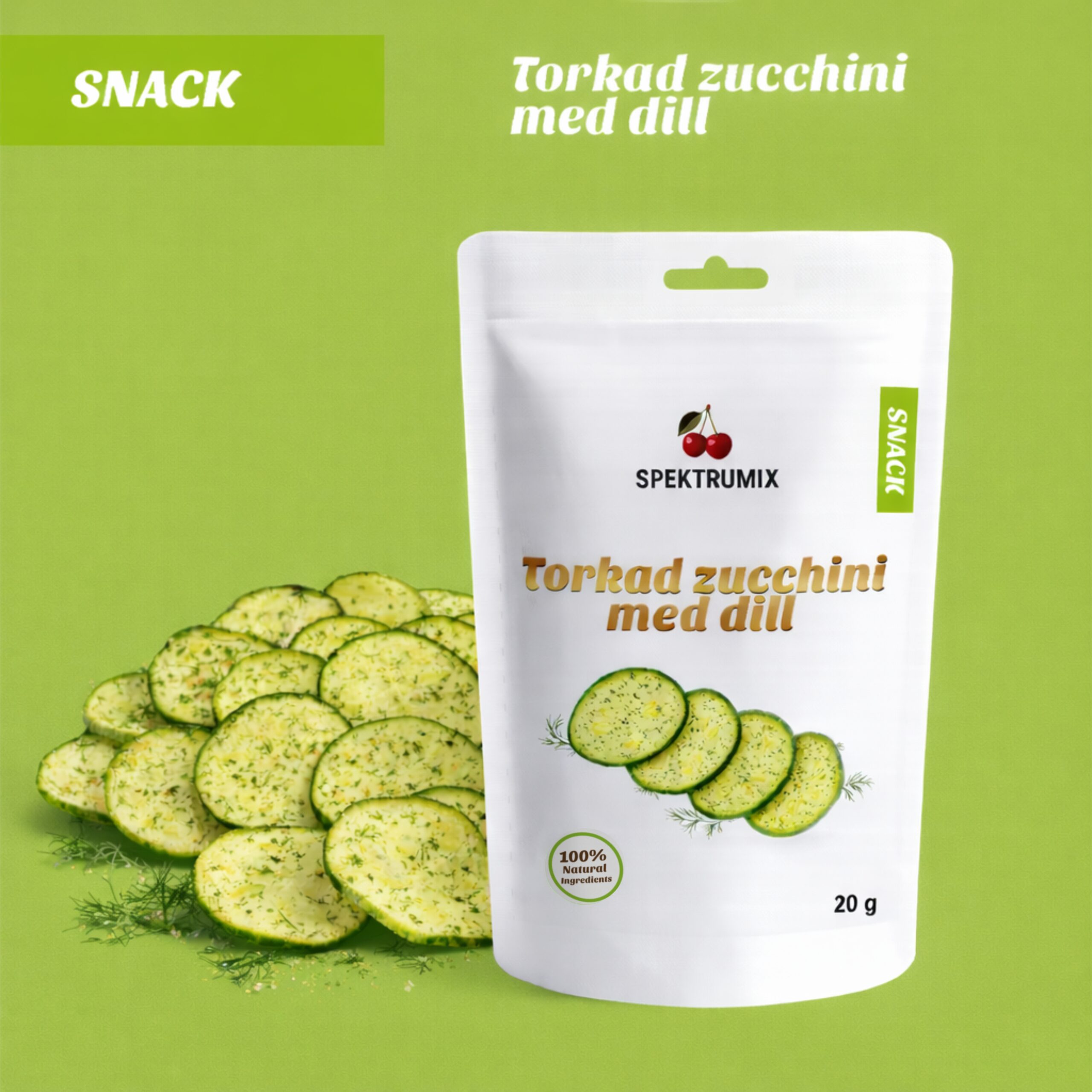 Torkad zucchini med dill. Krispiga zucchiniskivor med en mild dillsmak – ett gott och annorlunda snacks för dig som vill prova något nytt. Våra grönsakschips torkas utan olja och görs av 100% zucchini med tillsatt dill. Skivorna är torkade till en lätt och spröd konsistens och formade som små cirklar, vilket gör dem till ett smakfullt mellanmål.