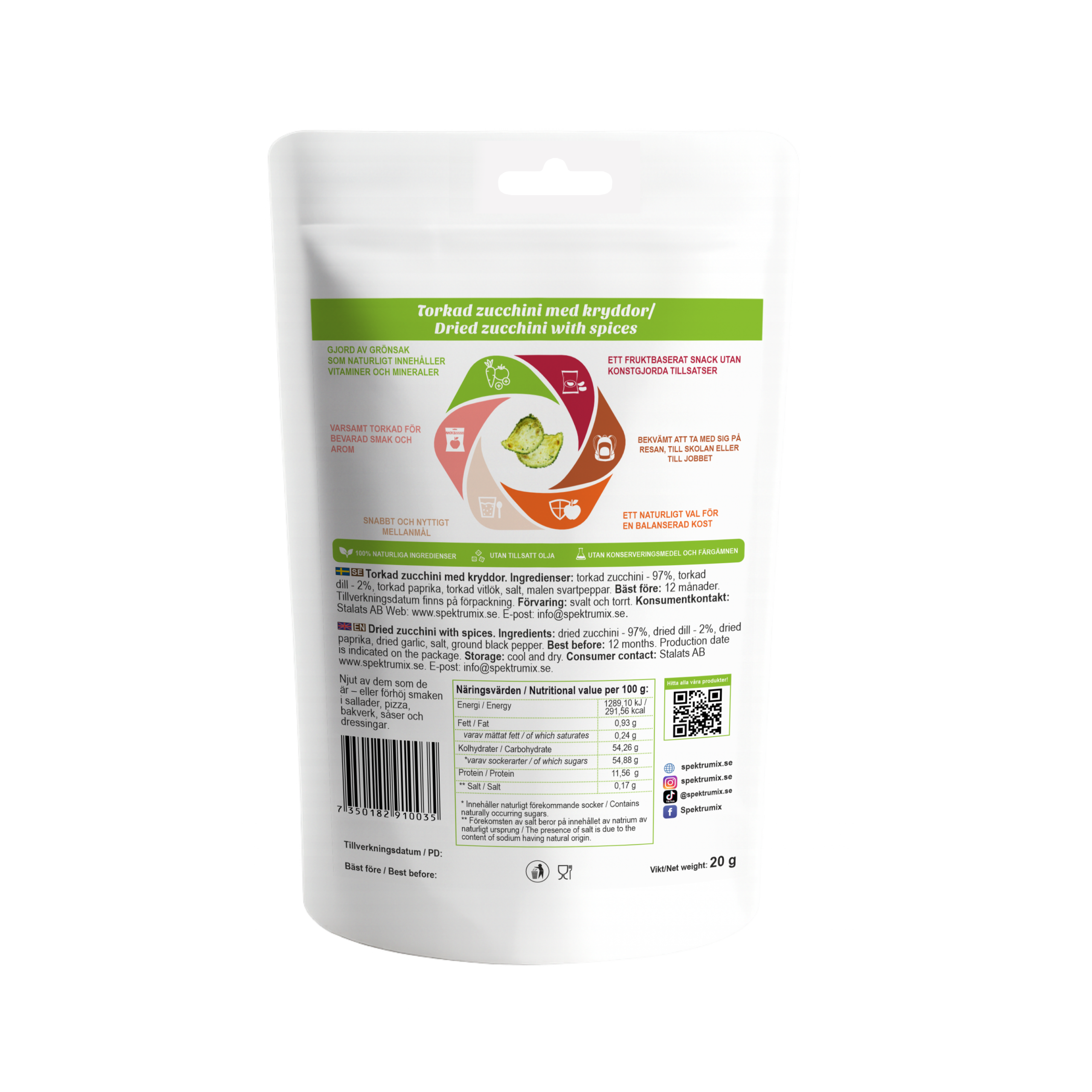 🥒Ingredienser: Torkad zucchini – 97 %, dill – 2%, torkad paprika, torkad vitlök, salt, malen svartpeppar